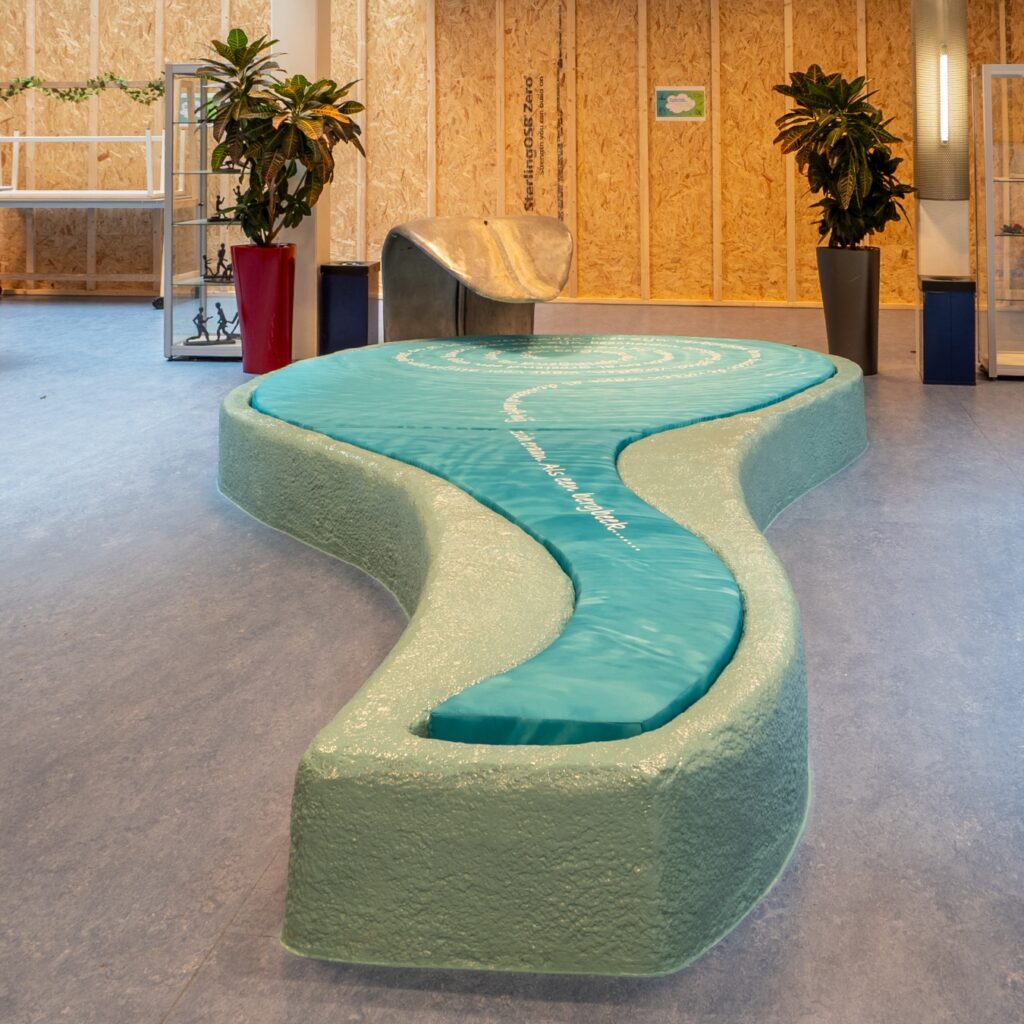 Het vroegere kunstwerk begon dus in de kantine. Vervolgens liep de tong met waterstroom, met aan de rand zitplekken, door op het schoolplein. Uiteindelijk kwam het water via traptreden in de vijver terecht. “De hangplek in de kantine wilde ik behouden”, vertelt Loes. “Het is een interessante en levendige plek. Studenten zaten op de rand van het bassin en hingen om de tong heen. Ik heb dus een creatieve vertaling gemaakt van de oude vijvervorm, met verwijzing naar het water dat in het midden neerkwam. Het kussen heeft de vorm van een rimpelvijver met waterstroom en maakt het tot een echt lekkere hangplek. En volgens de directeur hebben de studenten de chillplek inmiddels volop in gebruik!”