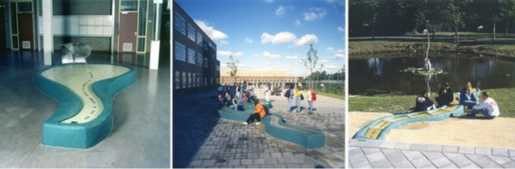 Jaren geleden werkte beeldend kunstenaar Loes Heebink aan een driedelig kunstobject op het Veenlanden College in Mijdrecht. Het kunstwerk begon met een grote tong in de kantine waar water overheen stroomde. Toen de school een deel van het kunstwerk op het plein buiten na een verbouwing verwijderd had, had Loes een creatieve oplossing. Van het waterbassin in de kantine maakte ze een comfortabele zitplek. Met kussens in de vorm van de oorspronkelijke waterstroom. Heb je ooit zulke creatieve kussens gezien?