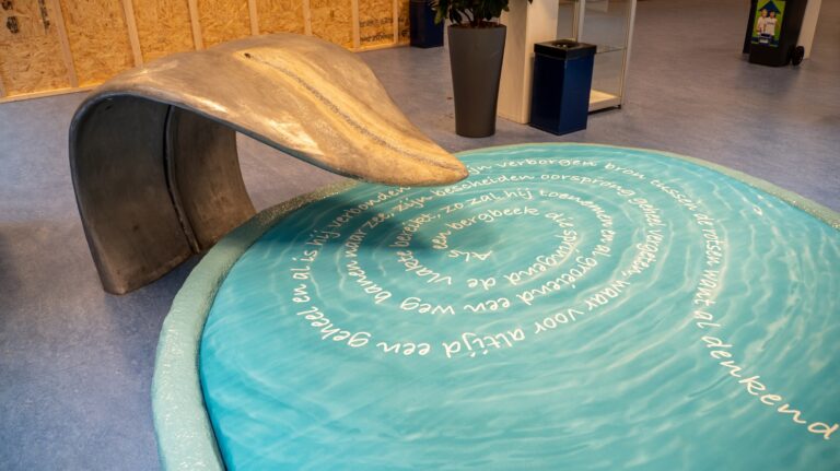 Op de zitplek wordt naar hartenlust gezeten, gegeten en gekletst. En in de vijver buiten ligt nog steeds een waterbloem die is samengesteld van allemaal kleine tongetjes. “Die tong staat voor communicatie”, aldus Loes. “Elkaar leren kennen. Het kunstwerk was tijdelijk geamputeerd doordat het middenstuk op het plein verwijderd was. Die plek heeft een totaal andere functie gekregen, het is nu geen verblijfsplek meer. Nu ik binnen een goede vervangende zitplek heb gecreëerd, is het kunstwerk weer compleet.”